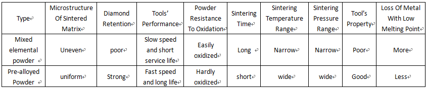Performance comparison table for mixed elemental powder and pre-alloyed powder: